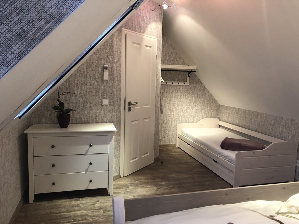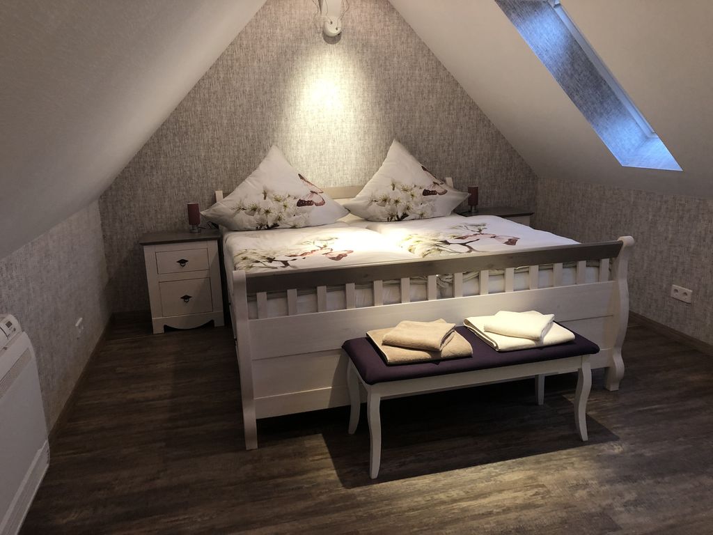 Es erwartet Sie ein Wohnzimmer mit gemütlicher Couch, Sat-TV und schicken Landhausmöbeln. Bücher, Gesellschaftsspiele und Malutensilien für Kinder sind vorhanden. Das Schlafzimmer besitzt ein gemütliches und großes Doppelbett, ein weiteres Einzelbett ist ebenfalls vorhanden. Auch hier sind wir dem Landhausstil treu geblieben. Die Belegung ist für 2 Erwachsene + Kind ideal. Leider kann man diese Belegungsform nicht hinterlegen. Deshalb erfolgt der Hinweis an dieser Stelle. Bei Bedarf können wir ein Baby Reisebett zur Verfügung stellen.